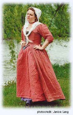 Because there are a minimal number of accurate activities to participate in, the Yorker women have attempted to pay strict attention to accuracy in clothing. This means tht we discourage extremes of presentation and encourage conservatism in fabric and pattern choices. Most of the time, we portray reasonably respectable farm wives, although once every couple of years or so we celebrate Polly Johnson Day, a day where we all dress in our best to honour the belle from New York City who married Sir John and endured many hardships and personal tragedy in the cause of loyalism.