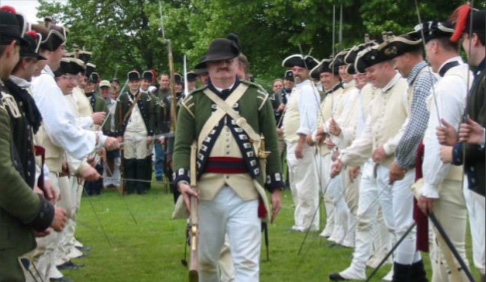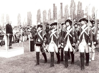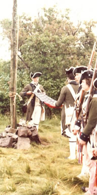 Finn and A/4 Wayne Heideman were both great comedians with very sharp tongues and ready wits, so there was nothing boring about those first few years. Finn retired from the unit after about five years. The second photo shows Finn and the red-bearded Wayne ready to move into battle for the 200th anniversary commemoration of the Royal Yorkers’ bloodiest engagement at Oriskany. Looking at their threatening visages, one can see that the rebels didn’t find much humour there.