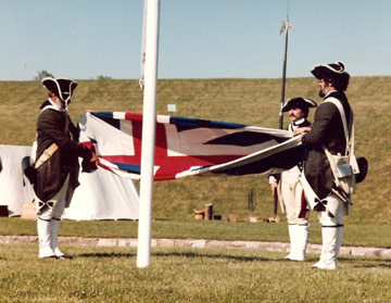 If I remember correctly, our regiment was first asked to raise the Grand Union at “Morning Colours” at Fort Niagara in 1981 and we quickly formed an impromptu Colour Party from the old left section of Sjt Denis Bourget (RCAF officer); L/Cpl Gerry MacMartin (RCN officer) and Pte Colin Gammon. The first pair of photographs captures that event.