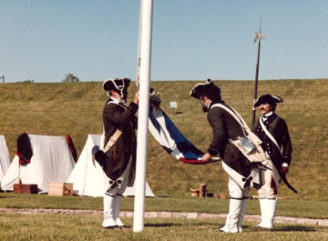 Our by-now tradition of fielding Colour Parties expanded and soon we were asked to perform the ritual at many venues. The initial three fellows by no means held a monopoly in this role and Sjt. Bob Anglin (Captain 3RCR and NDHQ) and Pte Len Skinner (Major 3NBH and NDHQ) were often called out when needed. One of my proudest memories was when the Brigade of the American Revolution asked us to provide a party to lower the American flag at Sackett’s Harbour. We again put together an ad-hoc party of the available experts and some other sharply-drilled soldiers and the duty was performed with precision and dispatch, including the correct folding of the US national flag. I think the BAR guys were gobsmacked and I ‘swole’ up like a ripe pumpkin. (unfortunately, most of that expertise has been lost and I’m not sure we could pull this off now).