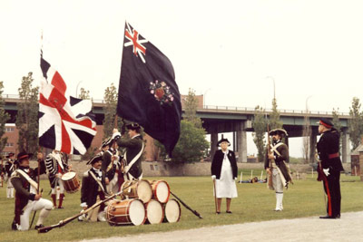 When our first set of Colours were awarded to the regiment in 1982 at Fort York, we were supported by our first two Honorary Officers, LCol Mrs. Elizabeth Blair, UE – Dominion Genealogist of the UELAC – and Major Judge John R. Matheson UE, RCA (ret’d). On this occasion, Gerry and Colin were the guards to the Colours and Lieutenant Bill Severin, Light Company, and newly-promoted Ensign of the Colonel’s Company, Denis Bourget, received the Colours. Back then, every member was given a rack number which was painted on his accoutrements. In my memory, Colin was the only fellow who took a serious interest in the man (other than Bruce Strader who proudly wore his ancestor’s number) who had originally been issued with that number – Duncan Murchison – and by pure serendipity, this fellow was an ancestor of Judge Matheson.